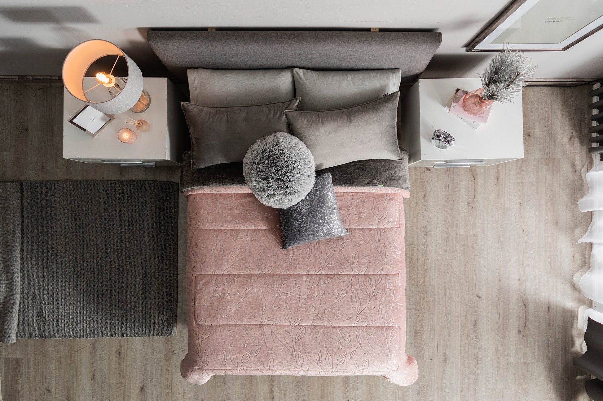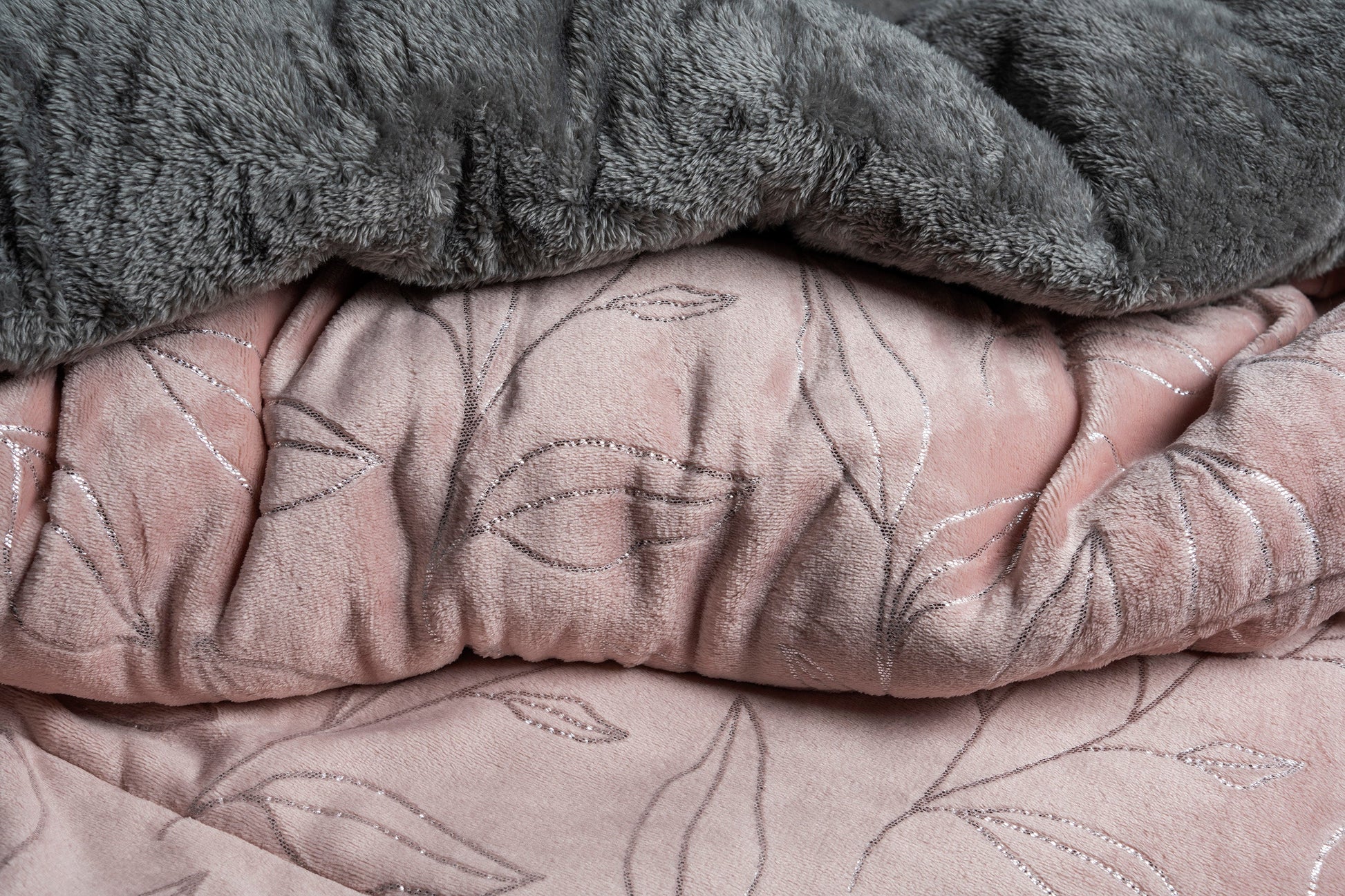 Modelo especial con tinta metálica que en la luz da brillo a tu cobertor. Un diseño rosa con hojas sutiles que le dan un toque mágico con los cambios de luz.