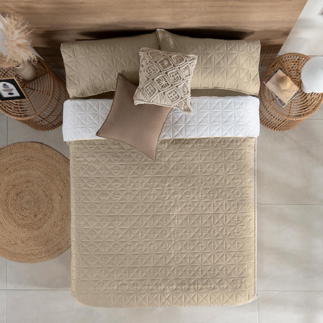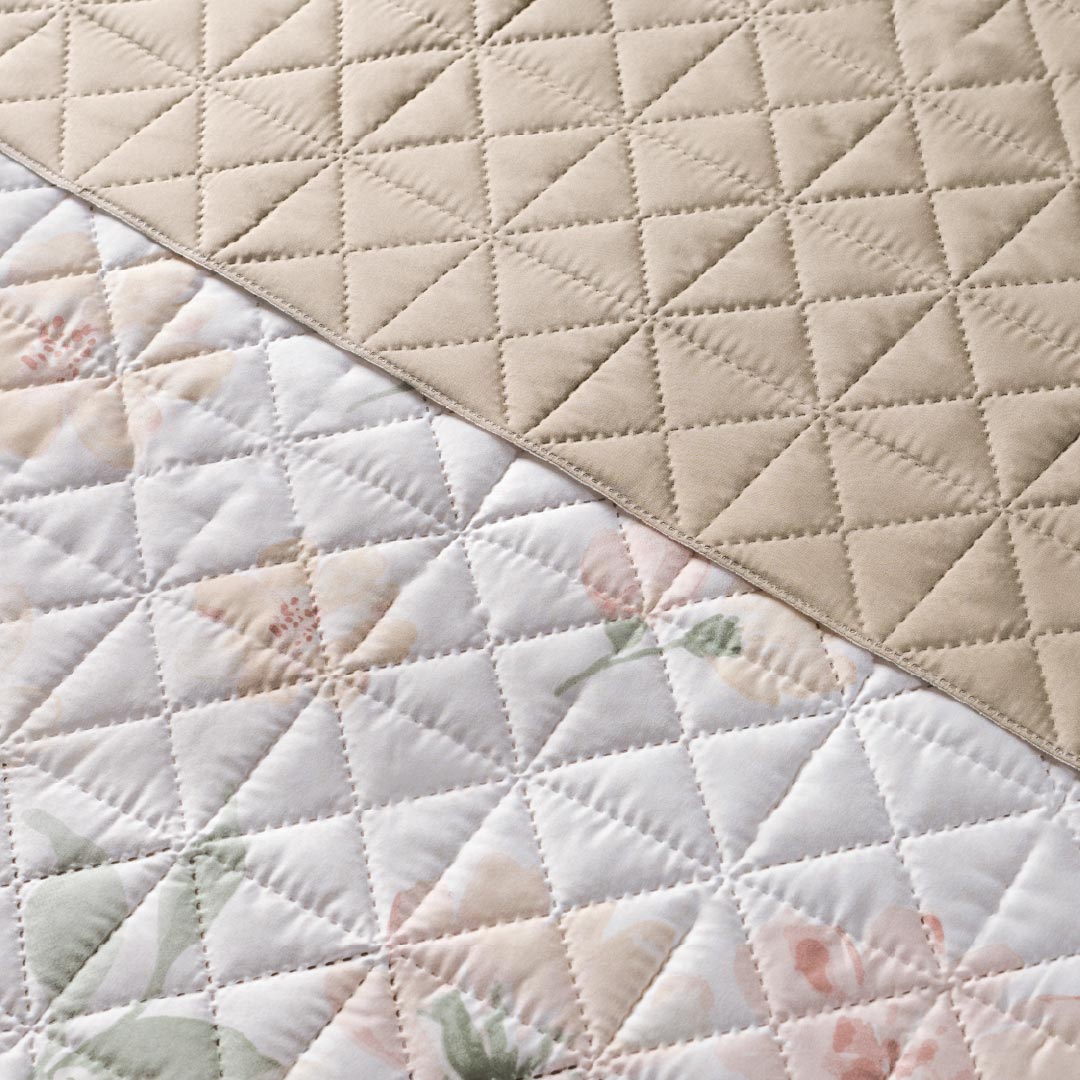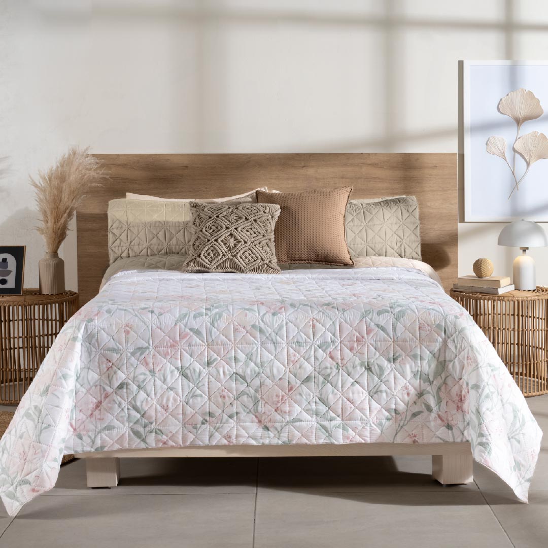El edredón Azalea es una pieza que irradia frescura y elegancia, ideal para transformar cualquier habitación. Su primera vista presenta un hermoso diseño en blanco, adornado con delicados motivos floreados en tonos suaves, creando una atmósfera de calma y feminidad. Al darle vuelta, la segunda vista revela un tono taupe suave, elegante y sofisticado, que aporta una sensación de calidez y comodidad, perfecta para equilibrar la vivacidad de la parte floral. La textura de este edredón es suave y acogedora, diseñada para brindar un descanso placentero mientras decora con estilo y armonía.
