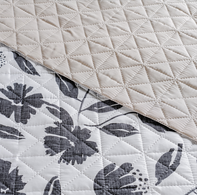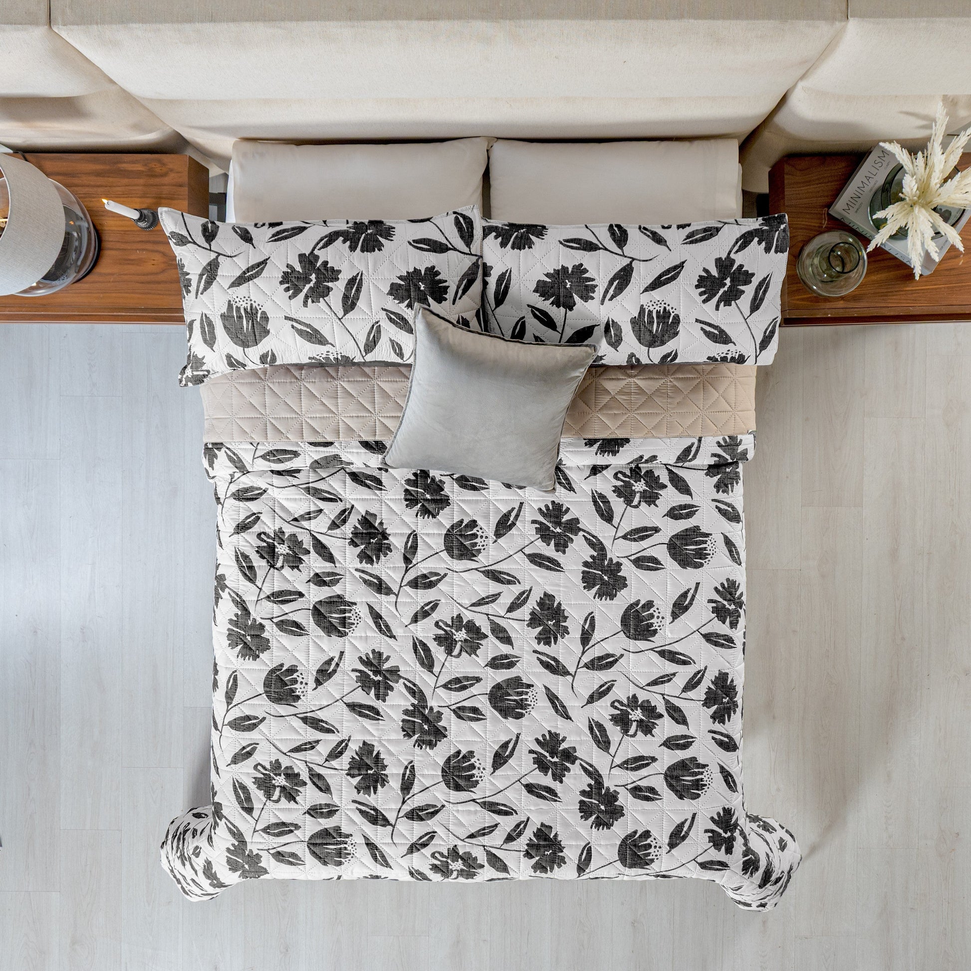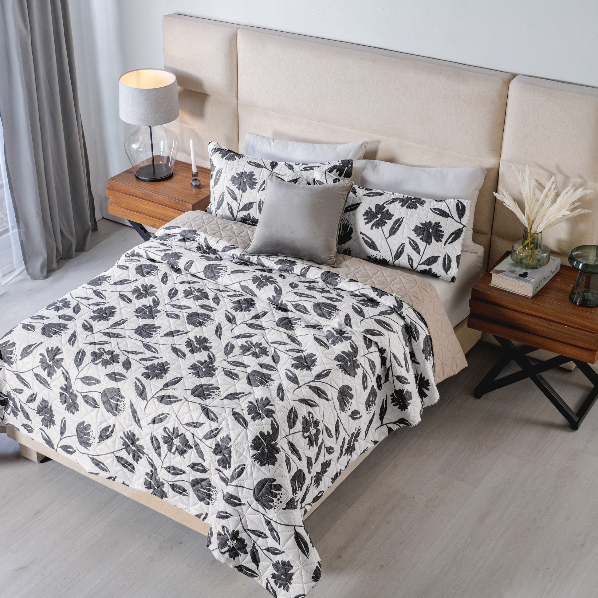 El edredón Sevilla es una pieza de diseño sofisticado que combina la elegancia clásica con un toque moderno. En su primera vista, presenta un fondo claro que resalta una serie de flores en color negro, creando un contraste llamativo y refinado. en su segunda vista, se revela un reverso en tono taupe, suave y cálido, que complementa perfectamente el diseño con un toque de calma y versatilidad. Hecho con materiales de alta calidad, este edredón no solo ofrece una apariencia impresionante, sino también una textura suave y envolvente que asegura confort durante toda la noche.